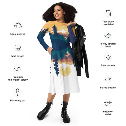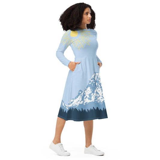 Mt. Rainier • Mountain Summer Sun Dress • Long Sleeve Midi Dress with Pockets