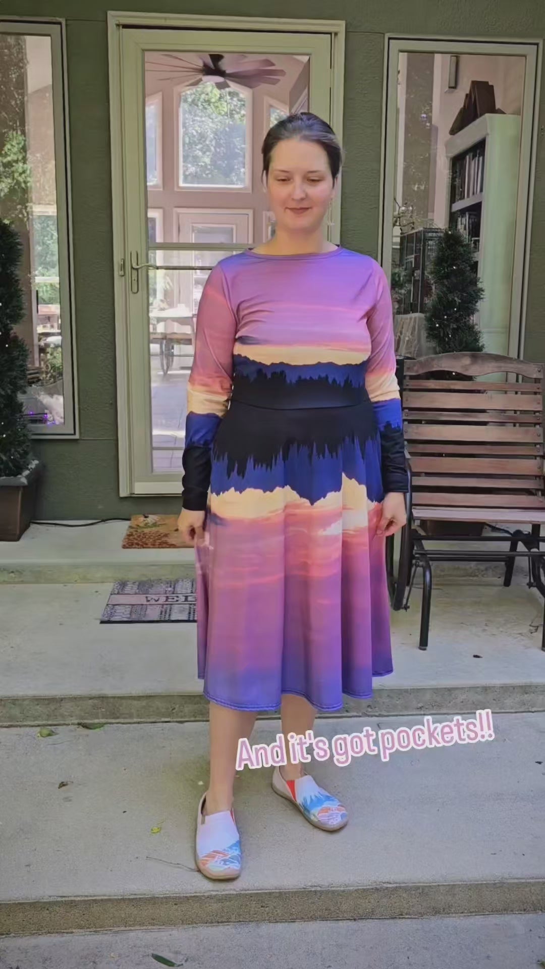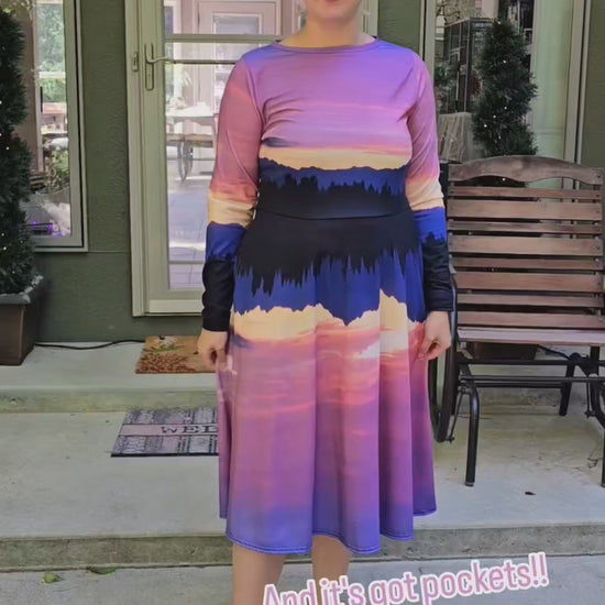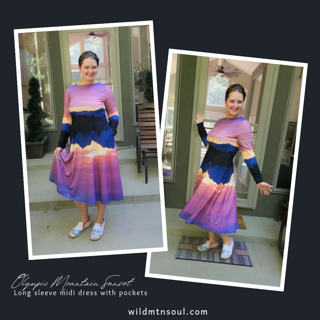 Meet your new favorite dress! Fashioned from a real-life sunset over the Olympic Mountains in Poulsbo, WA, its soft fabric and flattering cut will ensure you feel comfortable and feminine all day long. Plus, the fitted waist and flared bottom part of the dress will accentuate the wearer’s naturally beautiful silhouette. The best part about the dress? It. Has. Pockets.